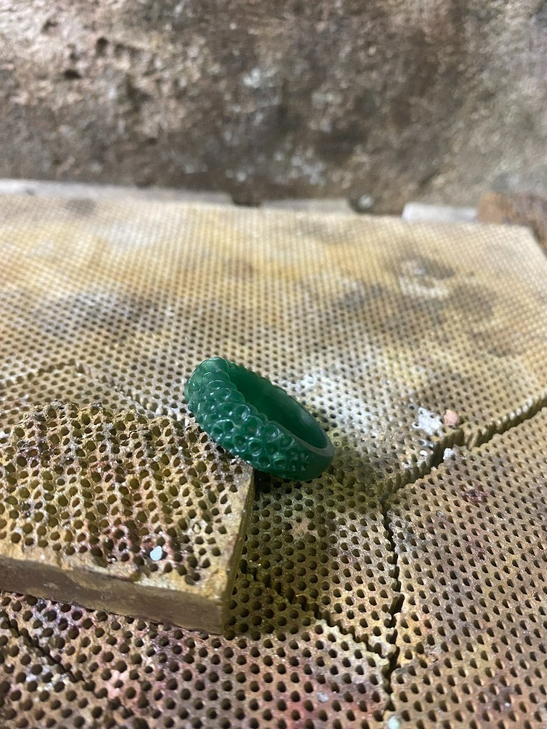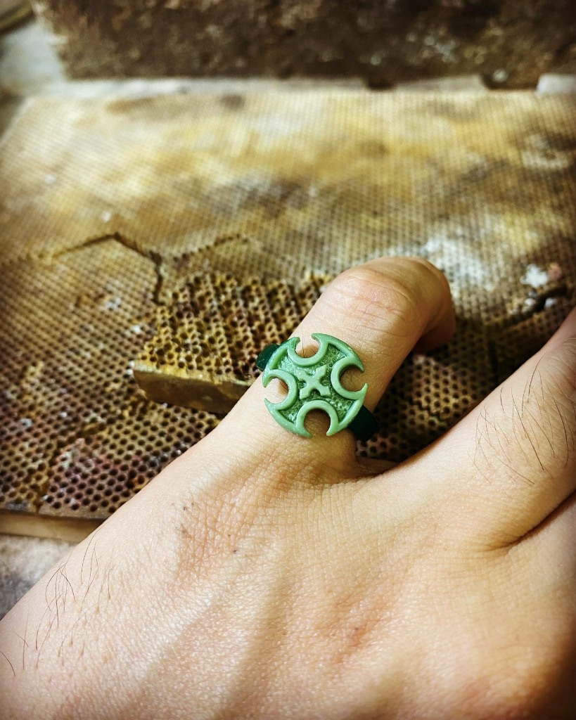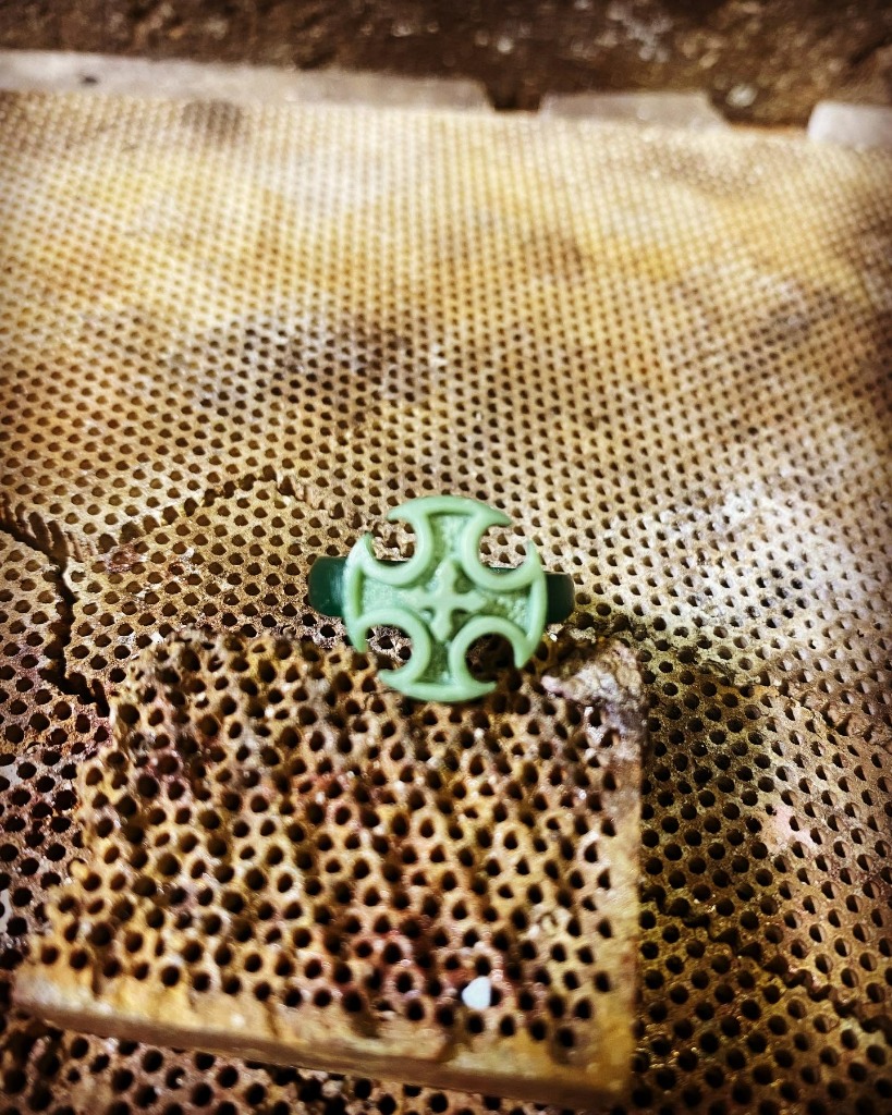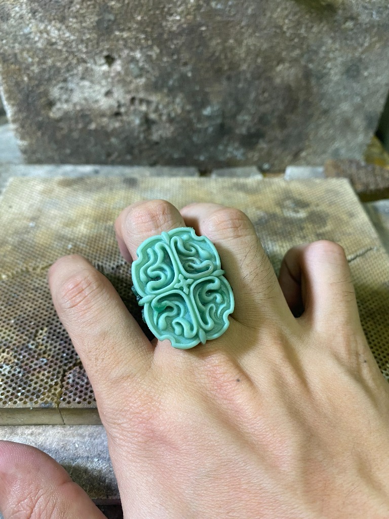 既存のパーツを修正して指輪にしました第3弾です!!今回は大ぶりなパーツを使っての製作で様々な箇所のバランスを整えながら行いました。一体化するためにリング部分との接合や光を通したら薄い部分も多かったので裏抜きのし直しをしたり、サイドを何かしらのデザインがしたいと付けたししたりなどなど・・・色々やっていたら時間がかかってしまいましたw指輪にできる大きさとしてはほぼ限界の大きさかなと感じております。次回も既存パーツの改造を行い、アイテムのラインナップを広げていく予定です。それが一巡したらまた完全な新作を増やしていきたいですね。