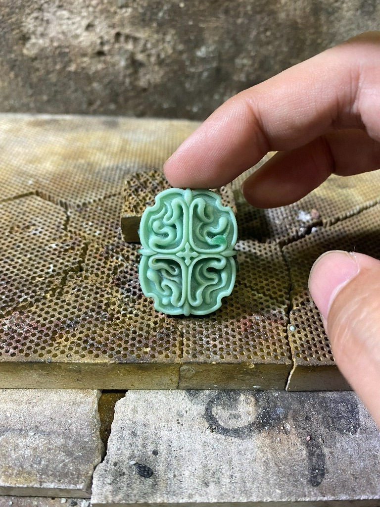 ワックスで新たに新作原型を製作しましたので紹介します。普段こういうティストのデザインは実はあまりやったことがありません。この直前に製作したものがドラゴンが咬むためのリングでありこちらはあまりデザインを考えず何となくこういう風にしたいというもやもやした状態で製作しました。いざ完成してみるとちょっと想像していたものとは少し違うものになり(よくありますw)こういうティストのアイテムもまた有りでは?という考えになり、急遽予定を変更しこのティストでの指輪を製作しました。特にモチーフは決めておりませんので〇〇〇モチーフというものはありません。強いてはサンゴ礁とかあたりに似てるかも?(笑)それぞれのアイテムには実はすべて一応仮で名前を付けておりますが、大体の名付けのパターンはアイテム製作後それを見てこれって〇〇っぽいなぁーって思ったらその名前になることが多いです。以前は商品名もすべて出していましたがなんかちょっと恥ずかしいなぁーという思いと、翻訳で英語表記にした場合この単語意味ちゃんと通ってるの??というのが非常に謎だったため、とりあえず現在商品名は付けずあえて品番のみということにしました。ただ品番のみだけだとデータで管理した際、これが何のアイテムだったかぱっと見よくわからないので仮の名前も一緒に付けておきます。ブランドをやられている皆さんは名前とかどんな風につけているんだろうか??次回の新作ワックス原型はすでに製作しておりますが少し商品ラインナップに厚みを持たせたいと思い、既存のアイテムで指輪にしてないものなどを指輪に落とし込むようなものを数点製作予定です。一からすべて製作するわけではないので時間はあまりかからなくできそうです。早く作ったワックス原型達をシルバーに鋳造したいですね~製作したマスターピース達(ゴム型を取る前の最初の原型のこと)も貯まってきておるので徐々に新作として出していきたいのですが、お金が無くなかなか進められないジレンマに陥っています(*_*;
