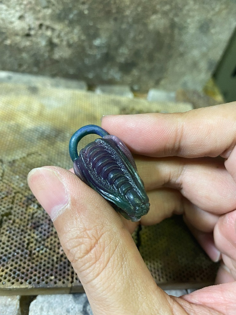新たに新作の原型を製作しました。あえて王道というかどストレートに龍を作りました。思ったより原型のサイズが大きくなってしまい若干使い回しが悪そうですwまずはペンダントトップでの新作として次にリングやブレスなど何パターンか考えています。使い回しがよいようにもっと小さいサイズで再度製作するのもありですね。龍が咬むリングは特にデザインを考えず自分の頭の中のなんとなくこんな感じといったもやもやなままで制作しています。こういうデザインのテイストもまた面白いなと思い、急遽次回の製作アイテムはこのテイストを使ったデザインのリングにすることにしました。すでに製作しております。龍と比べたら大ぶりでもないので多分あまり時間がかからずに完成しそうですね。とりあえず龍ではがっつり系の製作だったのでしばらくは軽めの時間がかからなそうなものの製作になりそうですね。早くワックス原型をシルバーにキャストしたいなぁ・・・