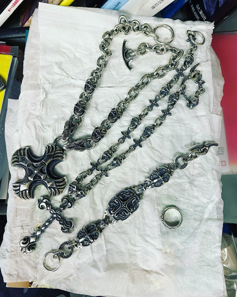 ブレスからと続き大物コーナーが続いております。やっぱり大きくて長いものは磨きが大変ですね!!何とかやりきりました。新たにペンダント用のチェーンを燻して磨きたいと考えていましたがこれは展示会が終わってからやることにします。忘れ物がないよう事前に必要なものをメモしましたが突然困ることなければいいなぁ.....とりあえず初めての1人の展示会ハラハラドキドキですがもしご都合よろしければお待ちしております!!