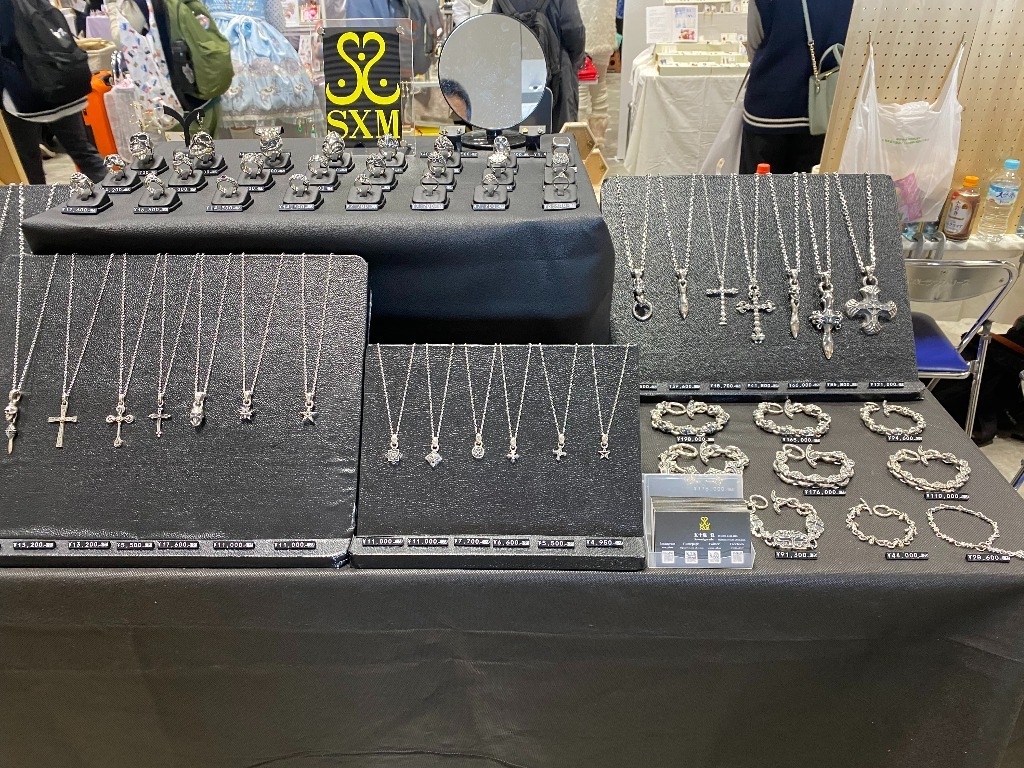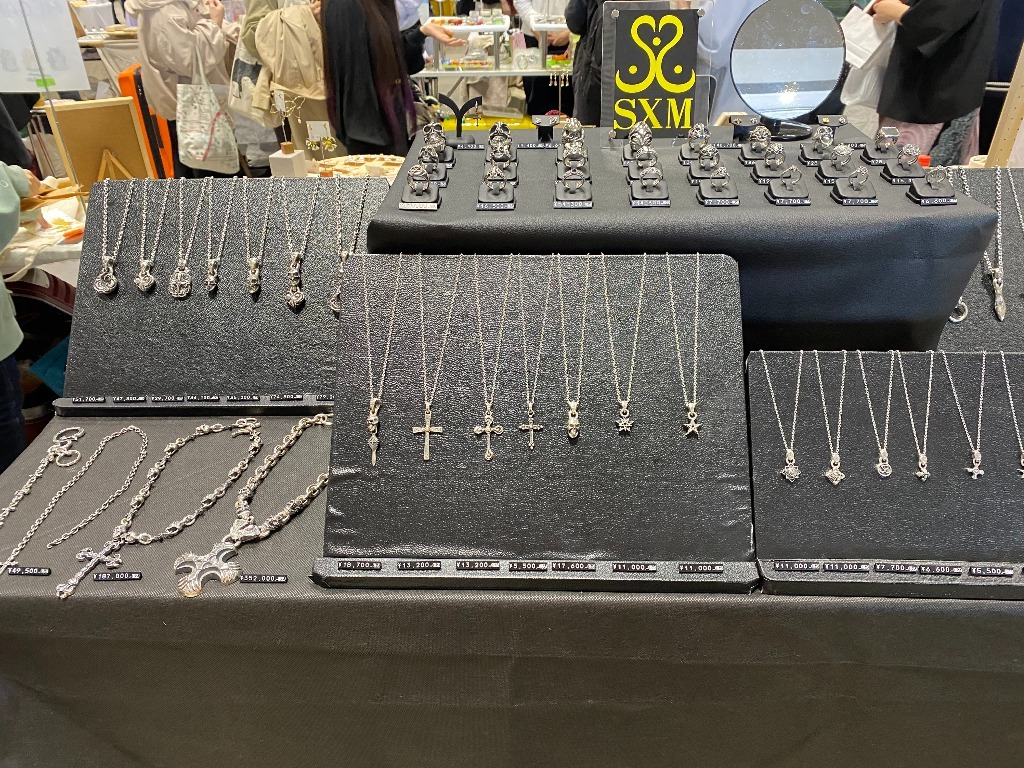 2022/11/19~20日に東京ビッグサイトで開催しましたデザインフェスタvol.56も無事終了しました。たくさんの皆様ご来場いただきまして誠にありがとうございます。前回のデザインフェスタが初出展となり今回は2回目となります。前回はまだテーブルやイスを用意しテーブルの上に並べただけでしたが今回は前回の反省点を活かしディスプレイをこの時までに準備してきました。何よりも見えやすさを重視しそのために何があればよいか?寸法や高さなども考慮し小型のテーブル、布、斜め掛けできるものはないか?などを考え集めてまいりました。結果としてだいぶ改善されたと感じております。この次に何かアンティーク調なものなどをディスプレイにおいて雰囲気作りをしたなと思っていたのですが、もうすでにテーブルが満杯で、置くスペースがありませんwペンダントトップを置く斜め掛けの台もMAXなので次回ペンダントトップを追加した場合は何かを減らしてそこに入れるかテーブルに直置きするかなどになりそうです(*´Д`)前回感じていた課題はクリアし前に進んだと感じております。しかし今回の展示会で感じた改善点がまた浮き彫りになりました。初日が終了し帰る前に片付けをしますがテーブル上にテーブルクロスをかけて帰る方が多いのは知っていましたが、意外と商品とかそのままの状態で帰られる方多いんですね。盗まれるなど怖くて全部しまって帰っておりますが確かにテーブルクロスは次回には用意したいと思いました(; ・`д・´)後は何よりもいかに来場者様へ買ってもらえるか?多分ここがもっとも大事であり、もっとも難しいところなんだろうと思います。とりあえず感じた点は値段は安いほど売れやすい、金額的には1万円以下程度で大体3000円ぐらいが多い?客層はシルバーアクセサリー好きな方などもちろん全体のせいぜい数%程度でありほとんどが祭り的な感覚で楽しみに来た、何か面白いものがあってそれなりの値段なら買ってもいいかなー的な人が大多数だと思います。そこにターゲットを絞るのが正解なのかどうか?、それともシンプルに売れるものではなく広告や宣伝という意味を兼ねて売り上げがたとえなくてもいいと割り切るのか?これから考えていきたいと思います。それなりの値段のものが絶対に売れないわけではなく、ブランドとしてすでに知名度がありリピーター、ファンの方がいる場合はまた別です。そのブースを目的に立ち寄ってくださるので、その場合はそういう商品も売れることもあるでしょう。何よりも知名度を上げることが重要と感じておりますので何をするのが有効なのか?常に自問自答をしもがいてもがいて何かしら今後も行動していきます((+_+))とりあえずまだはっきりと決めておりませんが展示会用にリーズナブルなライン用意してみようかなとかは思ってますが。しかしただ銀の板を丸めて指輪にするとか、例えば真鍮丸めてバングルにするとかもできますがそれで用意した場合、ただ売れることだけが目的になり何のために出展しているんだろうと焦点ボケしそうです(ブランドの宣伝とかからかけ離れて)。それなのであくまでブランドのラインの路線としてのアイテムでできれば作っていきたいですね。気軽につけるとなると指輪、ペンダント、イヤリング関係となりますが問題は指輪にはサイズがあるということですよね。各サイズすべて用意すると売れるかどうかのリスクや、手間や投資金額もかかってしまいます(もちろんそうやられている方もおりますが・・・)。もちろんオーダーで後日対応もよいですがやはりはその場で渡せた方がいいわけで最近フリーサイズで調整できる指輪も増えてきているのでそれにチャレンジする?などは密かに考えてます(言っちゃってるけどw)。後接客も本当は男性ではなく女性の方がきっといいんでしょうね。よく売り子を雇ってという話は聞きますが誰か手伝ってくれる人いるのかしら??一人で出展しているとどうしてもトイレとかに困るとかもあるのでよく聞くような誰か知り合いと合同で出展してカバーしあうとかも後々してみたいですね。このブログを見ている方でいいよー!!っていう方いたら是非お声がけよろしくお願いいたします(/・ω・)/色々とりあえずやってみてダメなら変えるという風に柔軟に考えていきたいですね。とりあえず次回のデザインフェスタは出展どうするかはまだ考え中です。